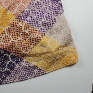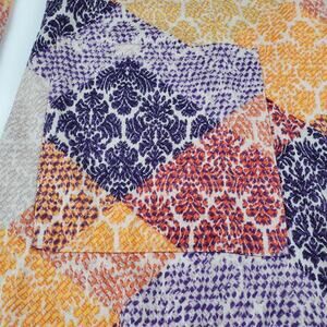 Features long, below knee cardigan, open draping front, 2 pockets, lightweight breathable fabric, beautiful jacquared quilted weave patchwork design