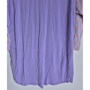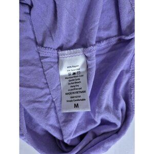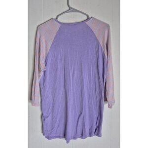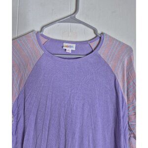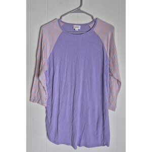 The Lularoe Simply Comfortable 3/4 Sleeves Pullover Shirt for women in size M is a versatile and colorful addition to any wardrobe. Made from a blend of spandex and rayon, this shirt offers a stretchy and comfortable feel, perfect for all seasons. With a classic round neckline and pullover closure, this shirt is easy to care for and suitable for casual wear, making it ideal for travel or everyday outings. The raglan sleeves and purple color add a fun and trendy touch to this LuLaRoe brand top, perfect for women looking for a stylish and comfortable T-shirt option. Pit to Pit 21.5" Length 28". (JOJO)
