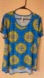 A vibrant women's XL top featuring blue & yellow geometric floral patterns. Lightweight, stretchy, and comfortable for casual or lounge wear.