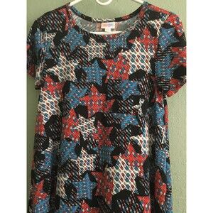 NEW WITHOUT TAGS VERY CUTE LULAROE SIZE XXS 4TH OF JULY BLUE RED WHITE STARSHIGH-LOW SHORT SLEEVE KNIT DRESS 95% POLYESTER 5% SPANDEX MACHINE WASH COLD.COMES FROM NON SMOKING HOME:MEASUREMENTS LYING FLAT:ARMPIT TO ARMPIT: 16 1/2"SHOULDER TO SHOULDER: 14"FRONT LENGTH: 34 1/2"BACK LENGTH: 39 1/2"PLEASE FEEL FREE TO ASK QUESTIONS.