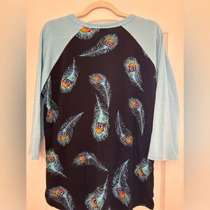 Lularoe feather Randy top. Navy blue with teal feathers and sleeves. Size large never worn, no tags.