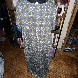 Lularoe loungewear, knit, comfortable, a-line, scoop neck, high low dress. Great for travel or everyday wear. Pair with a belt for a more fitted look. Approximately 23 inches from armpit to armpit, 45-48 inches long. In good, used condition. From a pet and smoke free house.