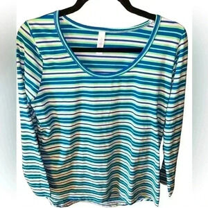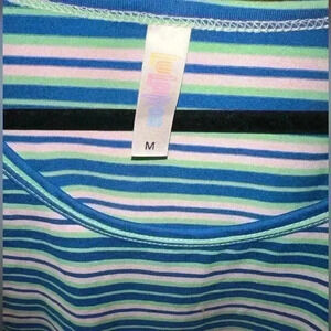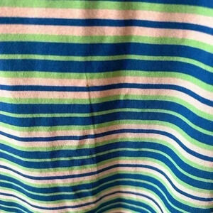 Fun stripe combo! Retro vibe! Pit to pit 19” . Length in front 26” length in back about 28.5”. 96% polyester , 4 % spandex. Made in USA