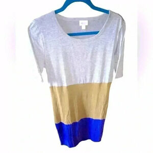 Love this! Grey , khaki, and a periwinkle blue tri color pencil dress . The perfect dress for the office this summer!