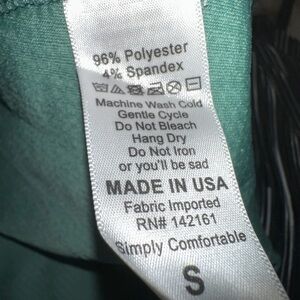 Very pretty green . There are two small snags on back at neckline(see pic) . 96 % polyester, 4 % spandex. Nice texture. Great work wardrobe staple for the holiday season!