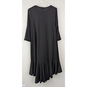 size S, slinky, stretchy, midi, high low dress, 3/4 sleeves bell at the ends, not lined, no pockets. Nice condition, no holes, stains or pilling