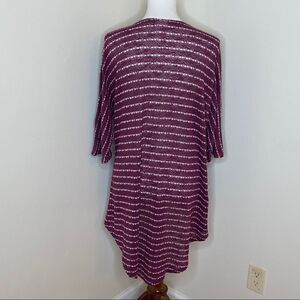 Burgundy lightweight sweater kimono with white stripes. Loose 3/4 length sleeves. High low hemline that drapes and flows. Very flattering. Great layering piece for your fall wardrobe. Much like an open front cardigan.
