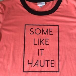 Smoke and pet free home Never worn Coral background with black lettering and trim. “Some like it Haute” Slight high low hemline Short sleeves