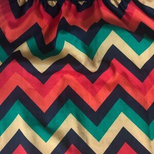 Orange, yellow, red, kelly green and black zig zag pattern.