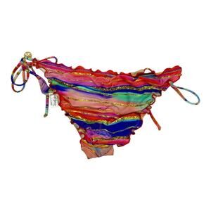 Luli Fama Bellamar Wavy Ruched Back Side Tie Bikini Bottom Size Large - lined in metallic gold, multicolor stripe with metallic