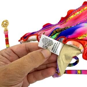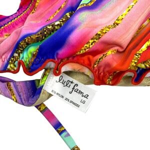 Luli Fama Bellamar Wavy Ruched Back Side Tie Bikini Bottom Size Large - lined in metallic gold, multicolor stripe with metallic