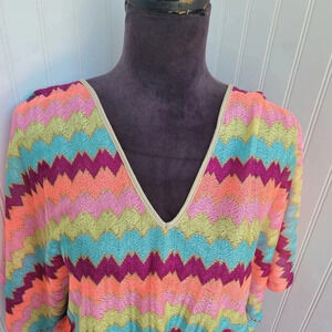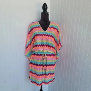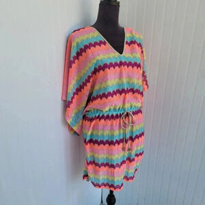 Luli Fama Cabana V-Neck Swim Cover-Up Dress Zig Zag Stripe Nylon Drawstring Sz L