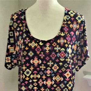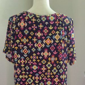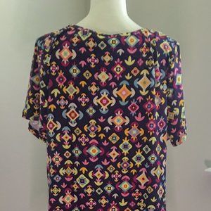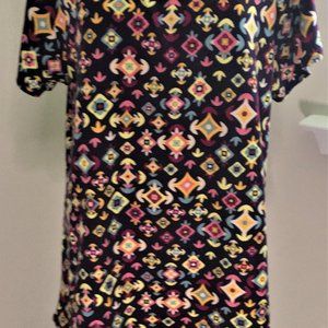 Scoop neck blouse with very colorful patterns over the entire apparel.
