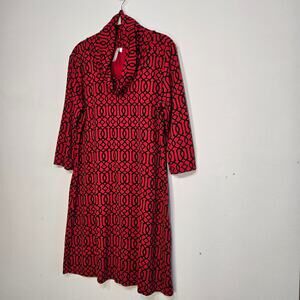 Lulu B Women's Red And Black Geometric Design Dress. Size Medium. 3/4 Length Sleeve. Cowl Neck; A-Line. Measurements Pit To Pit 19 1/2 Inches; Length 35 Inches; Sleeve 16 Inches.