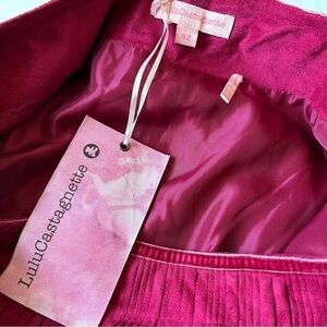 Gorgeous Lulu Castagnette pleated faux suede skirt in a rich berry pink hue. Features plissé pleats, a soft velvet side tie, and side zipper closure. Fully lined for comfort. The perfect balance of playful color and elegant texture — ideal for fall, winter, or festive occasions.