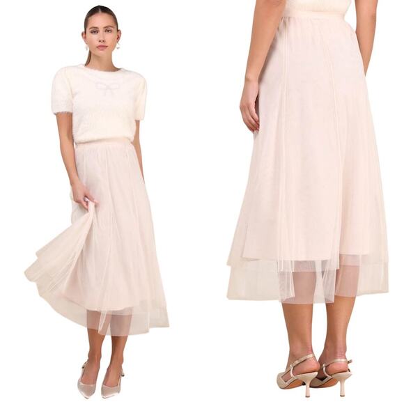 Lulu Fabulous Chicness Cream Tulle High-Rise Pull-on Midi Skirt size Small