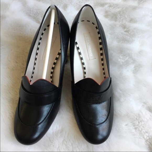 These classic loafers features a block heel and a smooth black leather upper. With a classic Lulu Guinness lip design enhanced in red lining