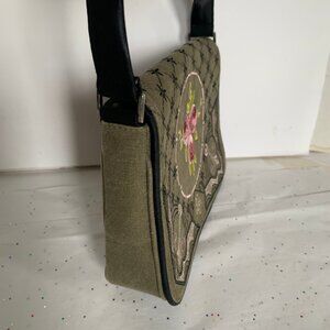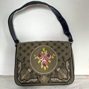 Lulu Guinness VTG 90 Y2K Green Canvas Floral Embroidered Shoulder Bag Purse FLAW - READ Description Please!!!