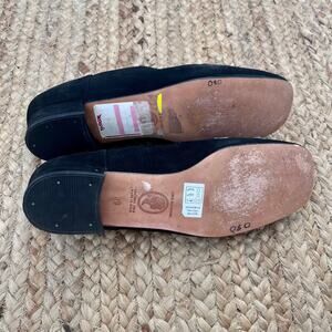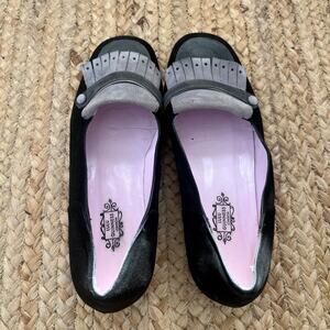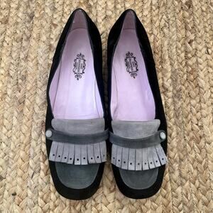 Lulu Guinness gray and black suede loafers in European size 39. Slim flats with fringe detail and strap across the top of the foot. Made in Spain. Very good used condition with some wear to the leather soles but no flaws to note.