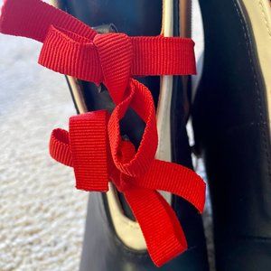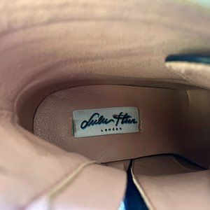 This is a gorgeous pair of Lulu Hun navy blue heeled booties, women's size 6. (Lulu Hun is a UK brand, so the size on the bottom is a UK size.) They were purchased from Modcloth and feature a zip closure, white accents, and red bows. You're sure to turn heads with these! With no flaws I can find, these shoes are in excellent pre-loved condition and come from a smoke-free home.