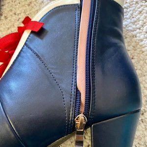 Lulu Hun navy blue heeled booties w/ zip closure & red ties, women's size 6