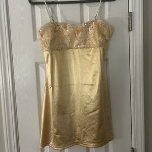 Sequin mini dress, yellow/ gold color, pearl straps, size medium, perfect length and fit. new and never worn