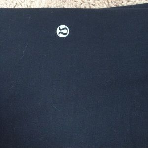 Black Leggings, with a grey and purple waistband. Flared at the bottom and LuluLemon sign on the knee area