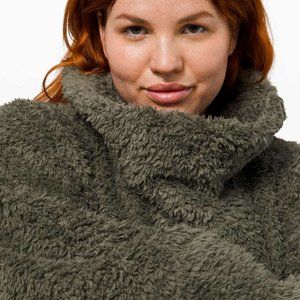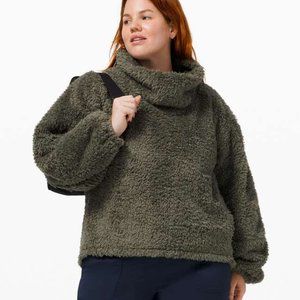 lulu lemon warm restore sherpa pullover in olive green color, super cute and cozy piece with a turtleneck /mockneck - perfect for running errands, going to class, etc. on those colder days