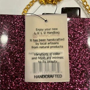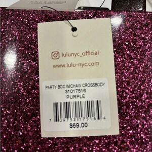 Lulu Party glittered acrylic box clutch with gold-tone hardware and chain crossbody-strap.