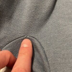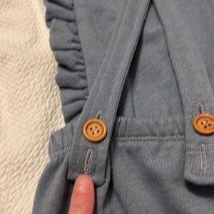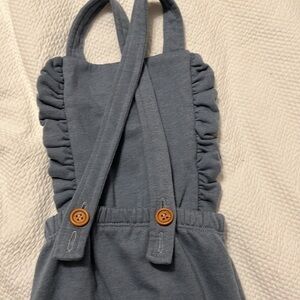 This cute little dusty blue romper has ruffle detail along the trim of the front. The straps have two button holes for extended wear. Miniature hole (when fabric is pulled on…see second to last pic) but at rest it is not visible at all (see last pic) GUC and so cute on. Fits on the slimmer side.