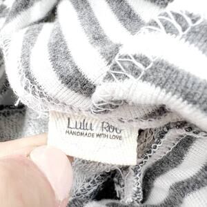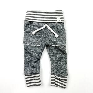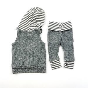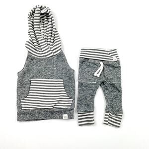 Lulu + Roo (now Little Roads Co.) two piece set. Hooded tank sweatshirt, gray with white stripes and matching pants. Size isn't listed, but fit like 0/3m, measurements provided. VGUC.