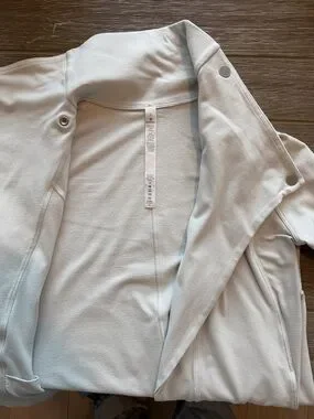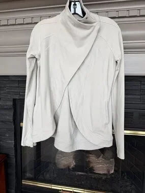 Unusual pale dove grey Lulu Rulu fabric Rally jacket. Snaps six ways to Sunday to create either cosy high neck or turned down collar. Pockets on both sides plus one inner pocket. Thumb slots. Excellent condition and no flaws.