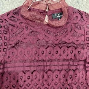 Lulu (Small) Burgundy lace dress. Long sleeve with see through lace detail on sleeves. Loose fitting