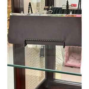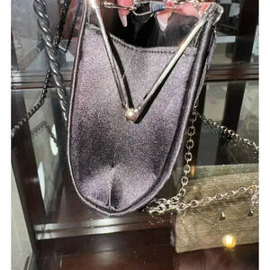 Elevate your evening ensemble with the Lulu Townsend Black Satin Clutch. This sophisticated piece features a pleated design adorned with a rhinestone-embellished bow, adding a touch of glamour to any outfit. The sleek black satin exterior and matching lining create a seamless, elegant look, while the silver hardware provides a chic contrast. With a detachable shoulder strap, this versatile clutch can be carried by hand or worn over the shoulder. Perfect for parties, cocktail events, and special occasions. Pre-owned, in excellent condition.