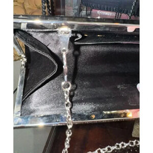 Keywords: Lulu Townsend, black satin clutch, evening bag, party clutch, cocktail clutch, rhinestone bow, pleated design, detachable strap, silver hardware, women's accessories, elegant clutch, pre-owned clutch, special occasion bag, shoulder strap clutch.