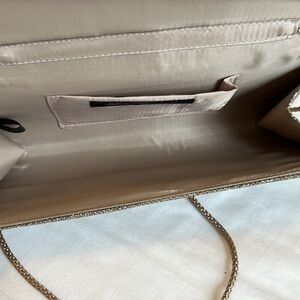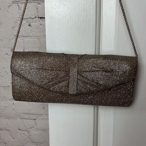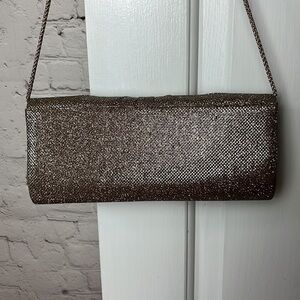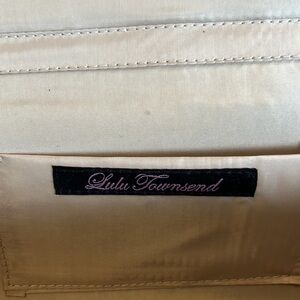 Lulu Townsend shoulder bag in sparkly champagne. Snap closure. Delicate shoulder strap. Small inner pocket. Shoulder strap can easily be tucked in to carry this bag as a clutch.