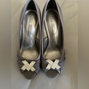 Step out in style with these elegant gray peep-toe heels. Perfect for any occasion, these shoes feature a chic design with a touch of sparkle. In very good condition.