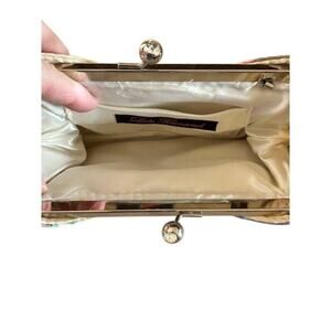 Add a touch of vintage-inspired charm to your look with this elegant clutch from Lulu Townsend. This soft satin bag features a pastel floral print in shades of yellow, gray, purple, and blue, shaped into a feminine bow design. The silver-tone kiss-lock closure opens to a smooth champagne-colored satin interior with a slip pocket—perfect for storing essentials on a night out or at a special event.