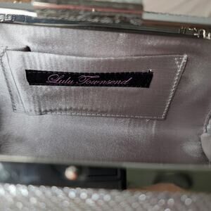 This Lulu Townsend silver evening bag sparkles with glamour and has a lovely vintage-inspired feel. It's adorned with glittering rhinestones or sequin-style sparkle (bling) throughout the exterior and finished with a silver-tone kiss lock clasp and matching chain strap, which can be worn over the shoulder or tucked inside.