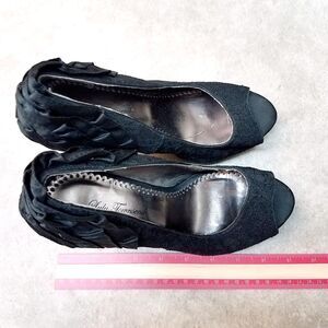Lulu Townsend Womens Gloria Size 7.5 Black Slip On Peep Toe Floral Heel