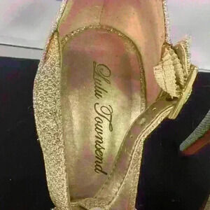 Lulu Townsend Women’s heels, size 7 1/2, with strap around ankle, color, gold, 4” heel, worn once, in excellent condition
