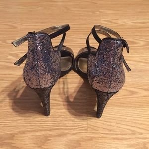Lulu Townsend glitter heels. Open toed. Gold, black, and pewter. Never worn. Two adjustable ankle straps.