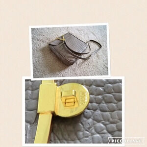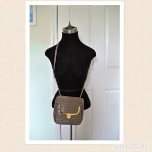 Beautiful Lulu by Lulu Guiness cross body bag. Measures 8" x 8" shoulder drop 22". Faux leather. Croc embossed. Gray color with gold tone hardware. Snap closure. Zip side pocket. In excellent condition! Beautiful, classy bag!