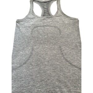 The LuluLemon Swiftly Tech Silver Sparkle Tank in size 8 is a versatile activewear top designed for women. This sleeveless tank features a crew neck and a racerback closure for a comfortable and secure fit. Made from a blend of nylon and spandex, it offers moisture-wicking and breathable properties, making it ideal for running and jogging activities in all seasons. With a solid gray color and a sleek design, this tank top from Lululemon's Swiftly Tech line combines style and functionality for the modern workout enthusiast. Very stretchy.