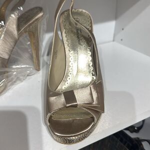 Chic satin heels with a bow accent. Features a shimmering platform. Perfect for special occasions.