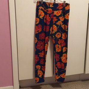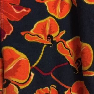 Navy background with vibrant orange, yellow, and red flowers; one size fits most but since a size was required, I put medium
