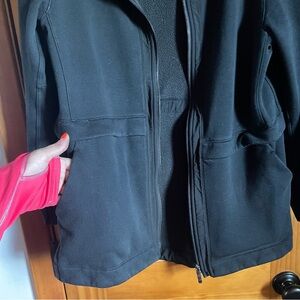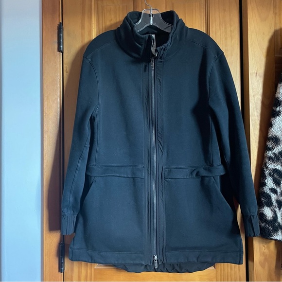 Lululemon full zip sweatshirt, black, size 10. Funnel neck, internal drawstring waist, two way zipper, pockets!