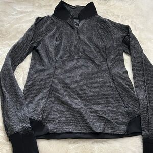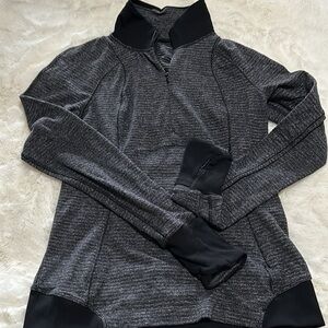 Lululemon half zip pull over in charcoal gray with black cuffs and neck. Side zipper detail.Ruched neck. I believe this is a size 6. Pit to pit is approximately 17 inches.