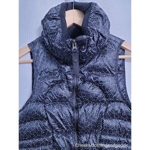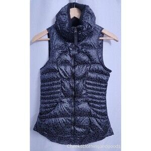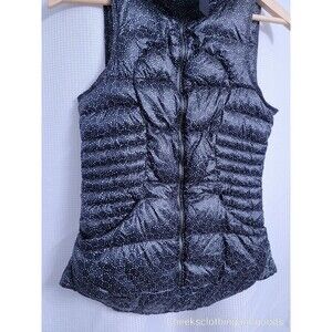 The vest is from Lululemon athletica, a renowned brand in the fashion market. It is a quilted style vest with down insulation material to keep you warm during winter. The vest's multicolor design, with a freckle flower theme, adds elegance to your outfit. This vest is perfect for an outdoor adventure or a casual day out with friends.