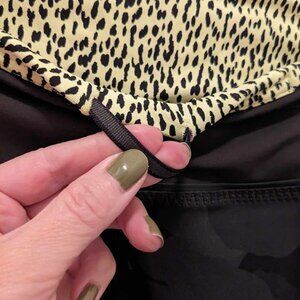 Lululemon 3/4 capri leggings. Green camo print, mesh panels at the back of the thighs, fun neon yellow print inside the waistband.